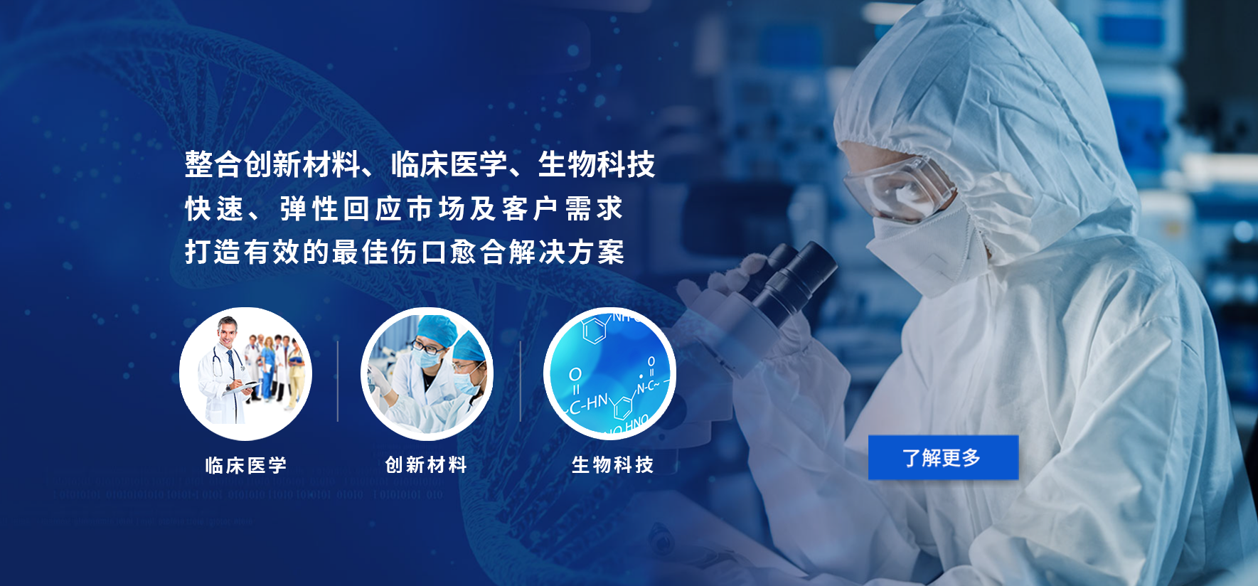 泰陞公司专注研究各种伤口愈合的转机,研发适合的创新材料,针对临床医师治疗伤口时,面对的痛点,以伤口疗程的概念,开发出解决痛点的解决方案及疗程产品,并经过生医实验方法的验证,再取得临床疗效的实证,以达到伤口愈合的结果。